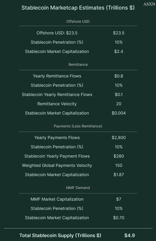 This market capitalization would of course grow linearly with increasing levels of market penetration in each segment, not with counting the more speculative use cases of stablecoins such as AI native payments.