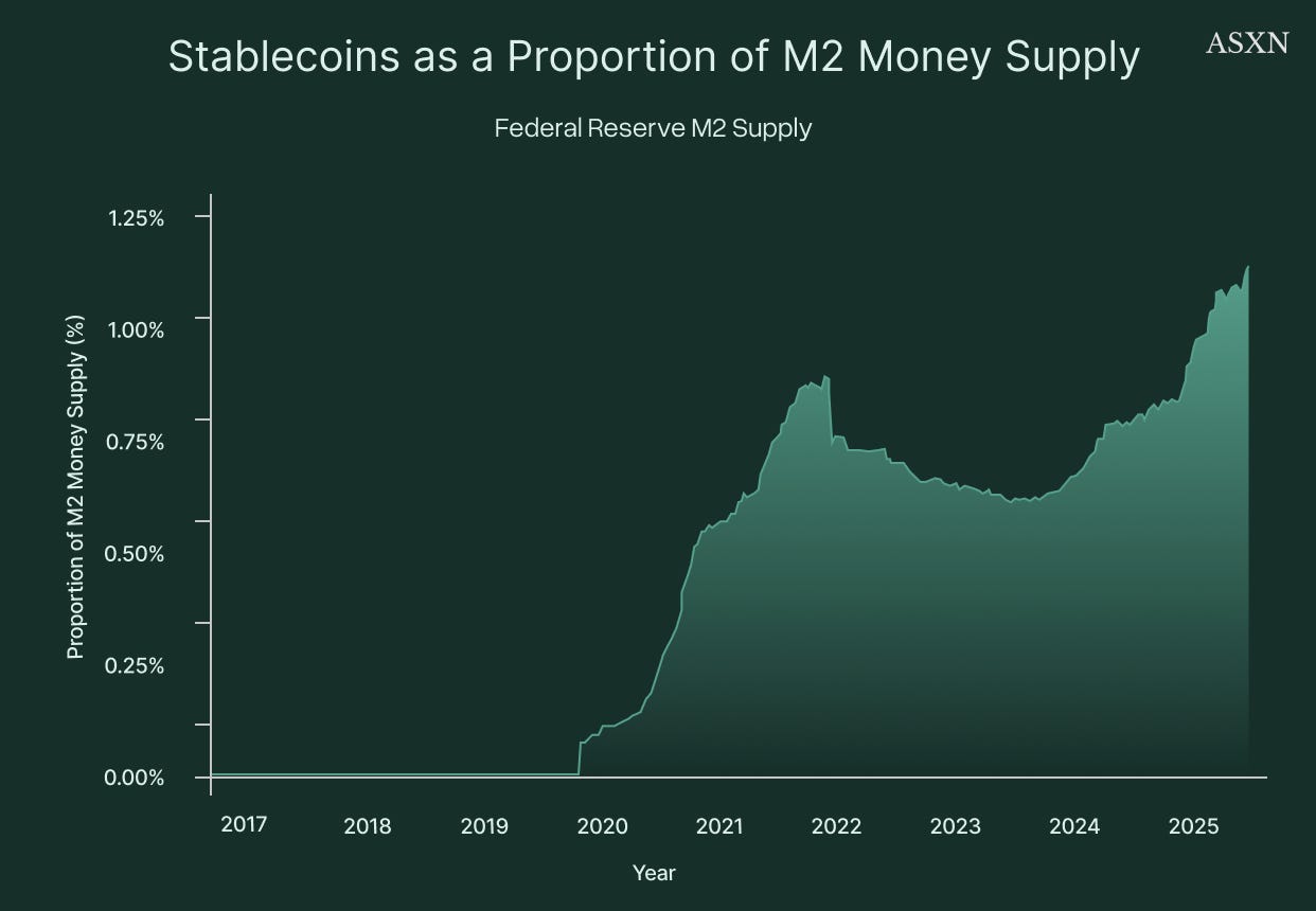 M2 (the broadest commonly cited measure of the U.S. money supply) comprises all of M1 (currency in circulation and checking deposits) plus “near-money” instruments such as savings deposits, small time deposits (under $100,000) and retail money-market funds. As of today, M2 stands at approximately $21.86 trillion, of which stablecoins account for just over 1.1 percent. With clearer regulatory guidelines, more robust infrastructure and the ongoing shift toward fully digital payments, we believe that stablecoins’ share of M2 could grow tenfold over the next ten years.