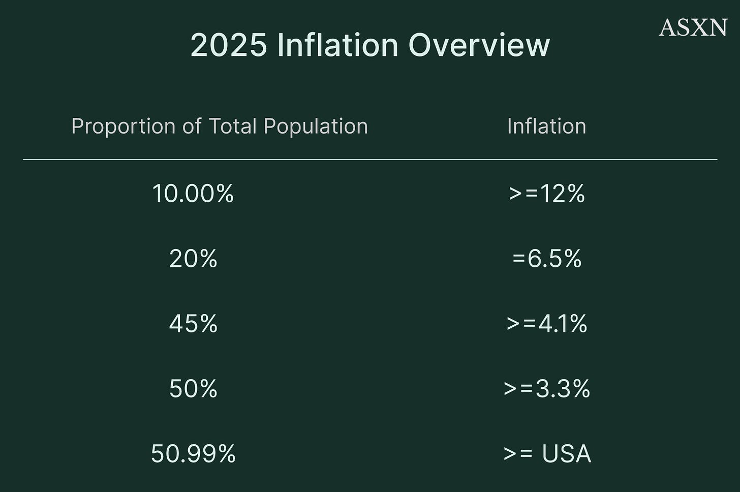 While most investors, particularly those in Bitcoin, recognize that the U.S. dollar is slowly losing purchasing power due to persistent inflation and currency debasement, as Ray Dalio aptly puts it, “the dollar is still the least dirty shirt in the hamper.” In fact, over 20% of the global population lives under regimes experiencing inflation rates of 6.5% or higher and over 51% live with worse inflation than in the USA (in 2025). In countries grappling with runaway inflation, weakening currencies, or strict capital controls, a grassroots financial shift is underway: individuals and businesses are increasingly turning to USD-pegged stablecoins as a store of value. Rather than hold rapidly depreciating local currencies, people in economies like Argentina, Turkey, Lebanon, Venezuela, and Nigeria are parking savings in digital dollars such as USDT, USDC, or DAI. In these environments, stablecoins function less as payment rails and more as digital savings accounts,offering a more stable alternative for preserving purchasing power. You can read more about this use case in our article on store of value here.